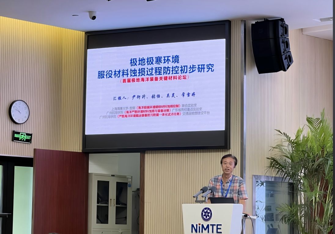 在主旨报告环节,尹衍升作为论坛联名主席,代表团队作了题为《极地极寒环境服役材料蚀损过程防控初步研究》的特邀报告。他系统阐述了在极地极端环境下装备材料所面临的多因素耦合蚀损机制,并结合团队长期研究实践分享了在极地环境服役材料蚀损防控等方面的研究进展和创新成果。